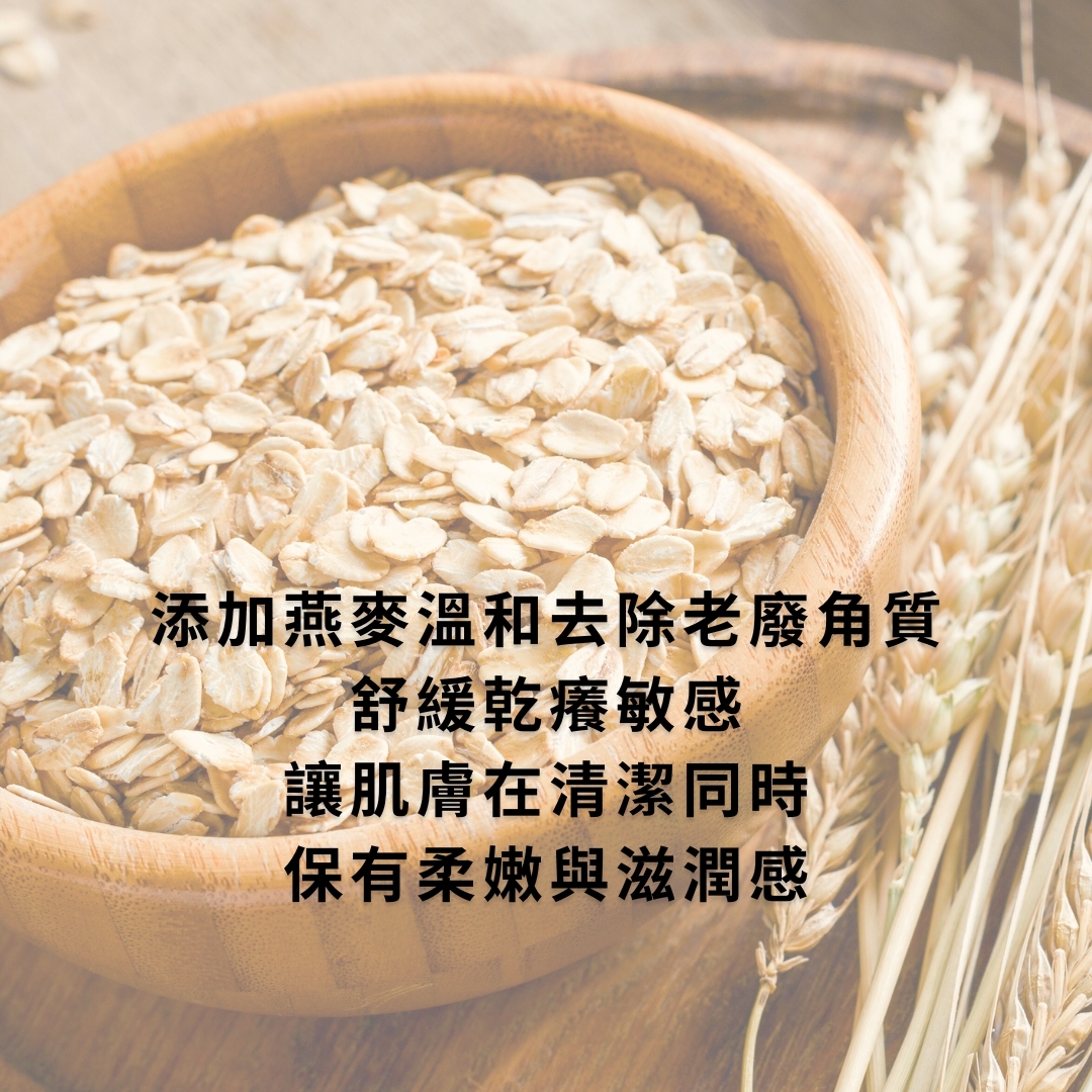 ‧添加燕麥溫和去除老廢角質並舒緩乾癢敏感,讓肌膚在清潔同時保有柔嫩與滋潤感。