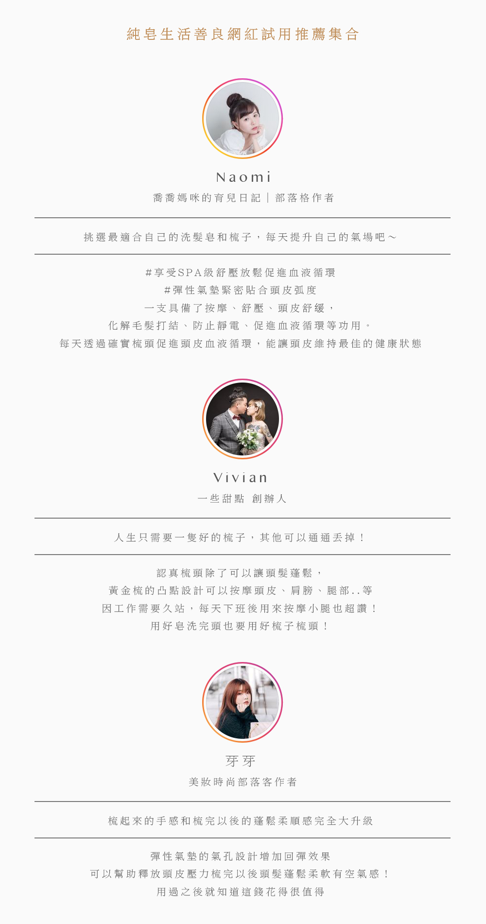 | 注意事項 | 1. 梳柄為天然柳木製成,以木頭自然紋理呈現,每一把色澤皆有些為差異。 2. 氣墊正面有排氣孔設計(並非瑕疵),氣孔的作用是為了增加氣墊的回彈度以及幫助通風,能更延長梳子使用壽命。 3. 原木製造無多餘染色加工,勿浸泡於水中,避免使用清潔劑或肥皂清洗。 |