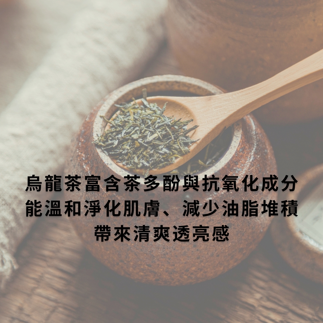 ‧烏龍茶富含茶多酚與抗氧化成分,能溫和淨化肌膚、減少油脂堆積,帶來清爽透亮感。