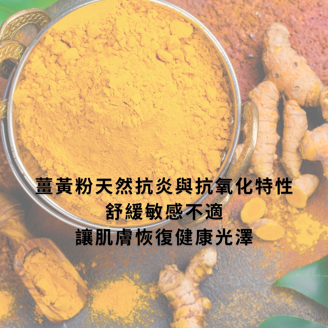 ‧薑黃粉具有天然抗炎與抗氧化特性,舒緩敏感不適,肌膚恢復健康光澤。