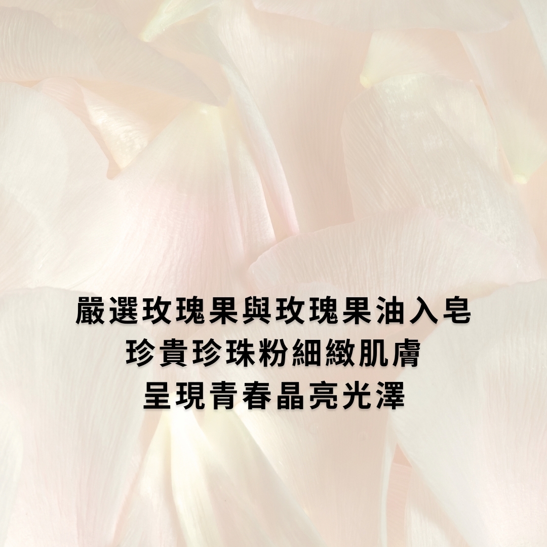 ‧嚴選玫瑰果與玫瑰果油入皂,珍貴珍珠粉細緻肌膚,呈現青春晶亮光澤。