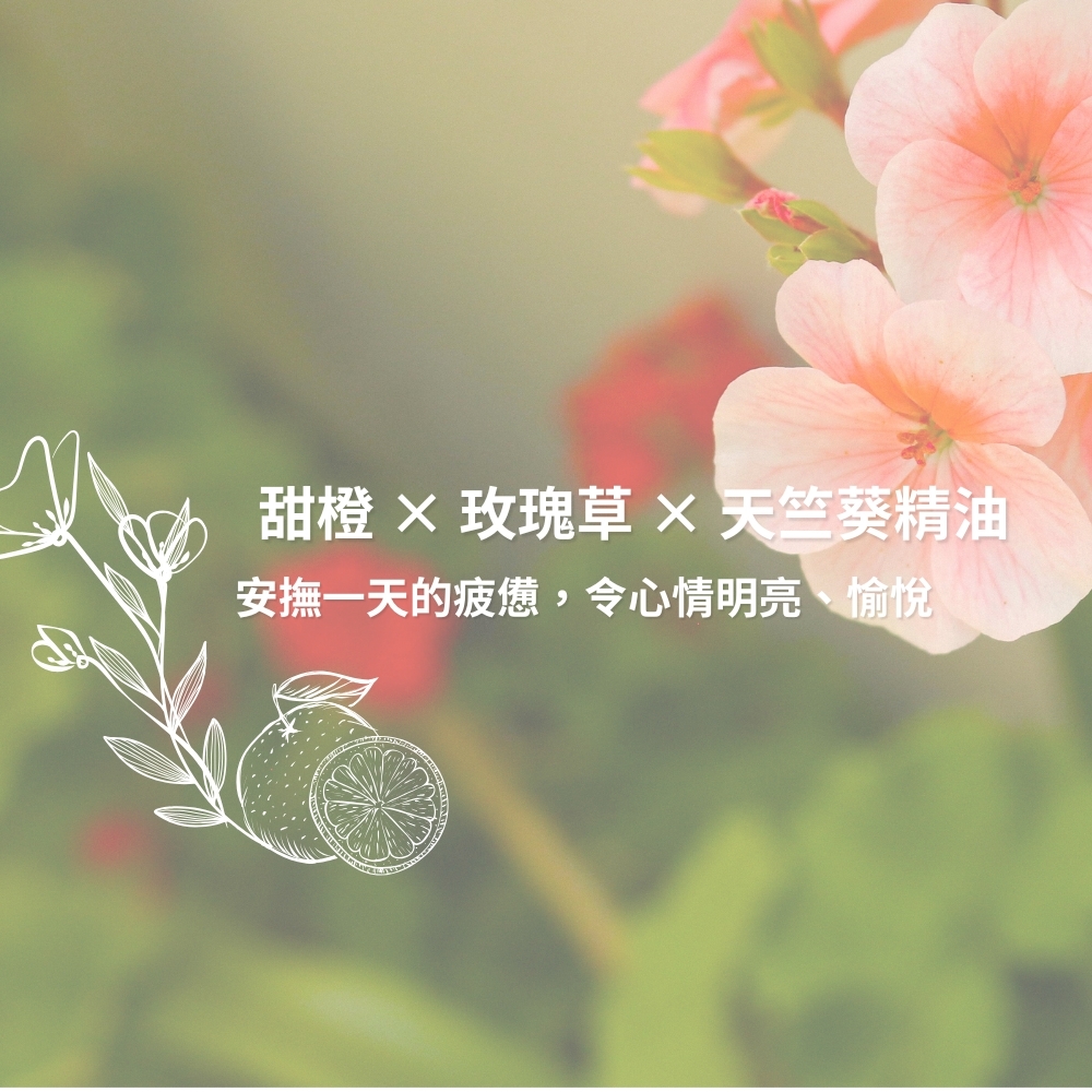 香味:花香×柑橘(甜橙、玫瑰草、天竺葵)